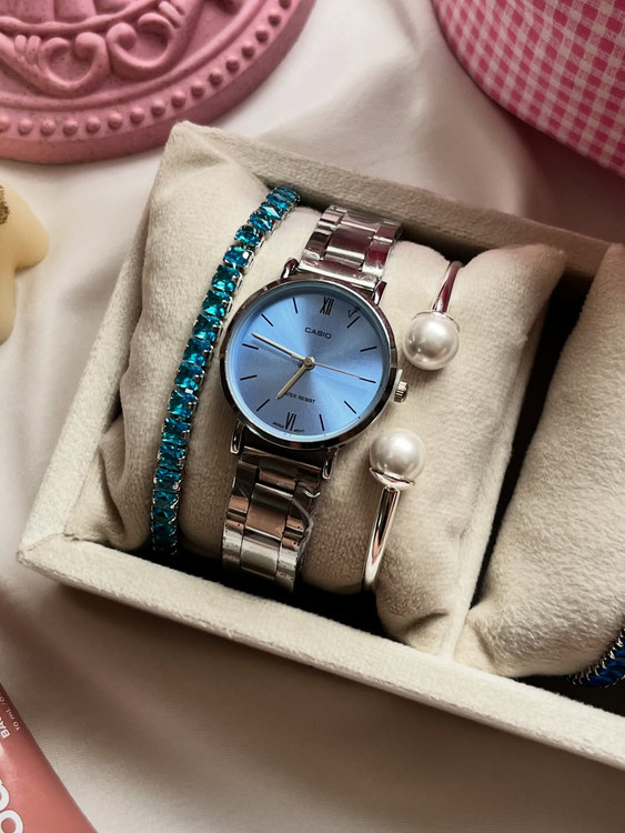 ست ساعت و دستبند کاسیو آبی روکش نقره