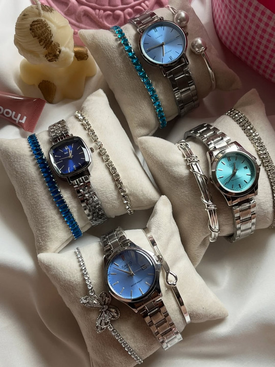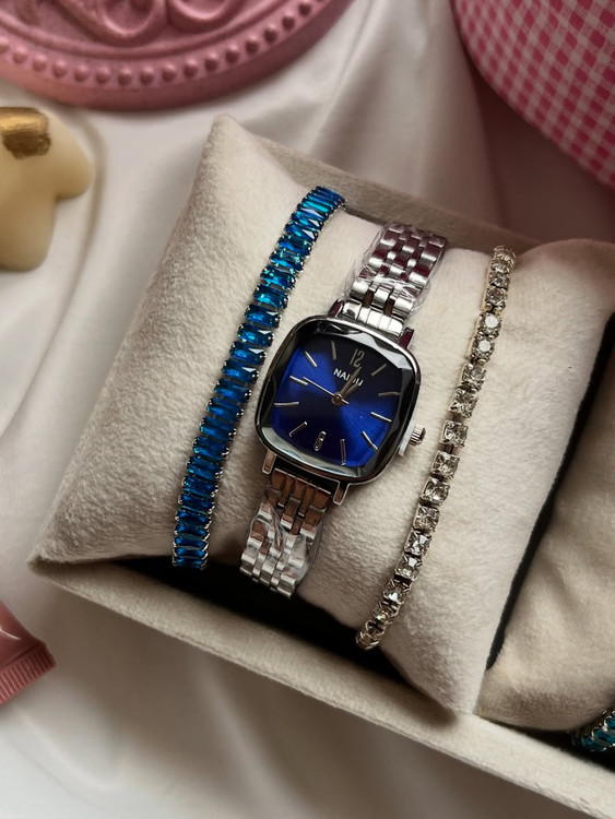 این ست شامل ساعت کاسیو استیل با موتور ژاپنی و دستبند تنیسی آبی میباشد. طراحی زیبا و رنگ ثابت آن مناسب هر سلیقهای است. روکش نقره