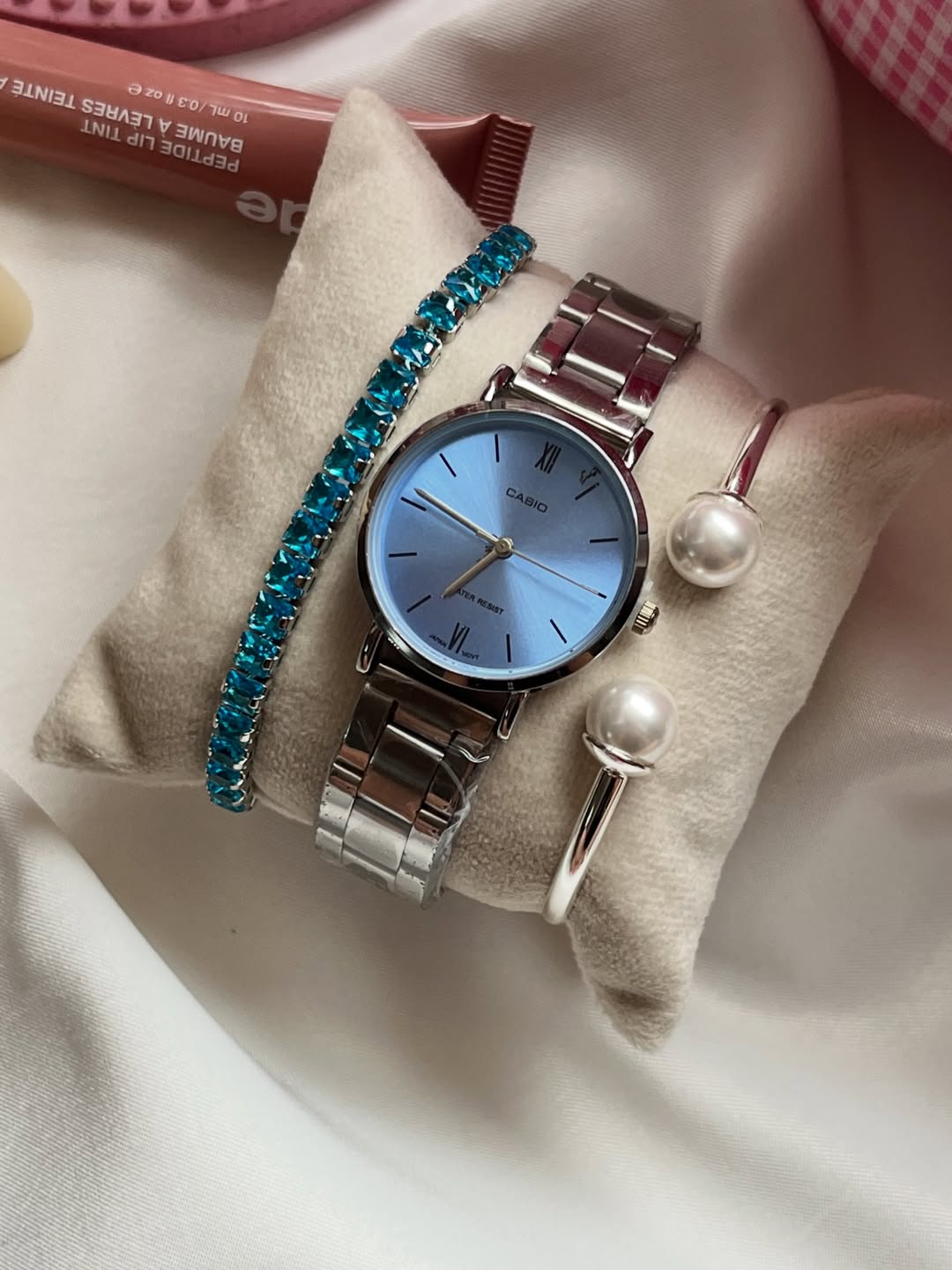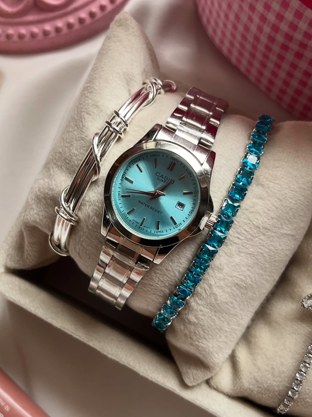 ست ساعت و دستبند کاسیو آبی روکش نقره
